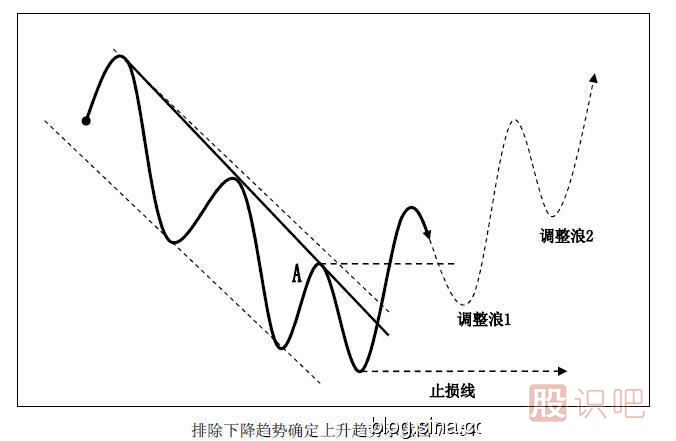圖【排除下降趨勢確定上升趨勢示意圖7-53】中,價格已經(jīng)突破了下降趨勢線、拐點線和分界點A,根據(jù)趨勢交易法的假設(shè),我們此時排除了之前下降趨勢發(fā)生的可能性,確認(rèn)未來將展開上升趨勢,如圖【排除下降趨勢確定上升趨勢示意圖7-54】所示。