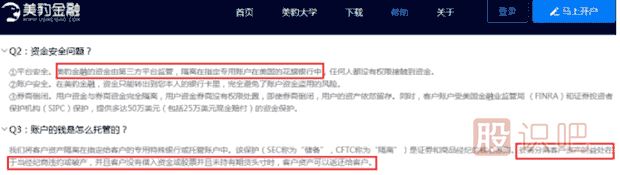 這時候就要看你的錢是給了國內代理商幫你看管,還是直接給了專用特殊銀行幫你看管。一般底層美國券商為了防止國內代理商跑路或者經營不善,都會采取隔離手段,也就是你通過代理商平臺購買美股的資金會存放在專用的特殊銀行,當代理商違約或破產時,底層券商就可以將用戶的錢返回給用戶 。還是上面兩個代理商的例子,我們來看下。美豹