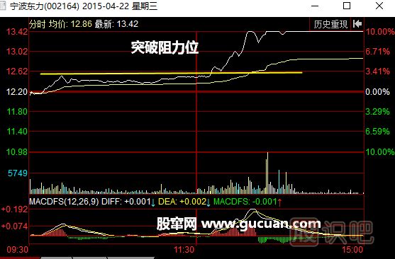 上午收盤前,股價(jià)快速上漲,突破了這個(gè)阻力區(qū)間。該形態(tài)說(shuō)明有較強(qiáng)的多方力量進(jìn)入,開始將股價(jià)持續(xù)