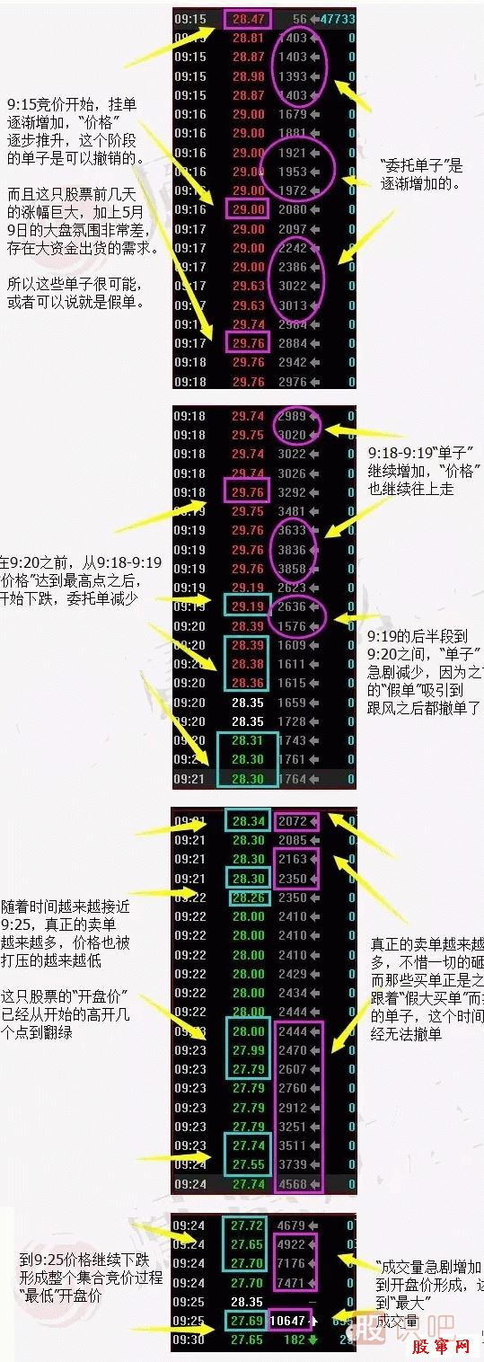 9:15—9:20:這五分鐘是開放式集合競(jìng)價(jià),可以委托買進(jìn)和賣出的單子。這段時(shí)間是可以撤單的,因此這個(gè)時(shí)間段你看到的活躍個(gè)股的成交量基本上都是假的,因?yàn)楹芏啻髥问枪室鈷斓?,他們?huì)在9:19:30之后撤單,根據(jù)開盤價(jià)的最大成交量原則,撤單后成交量最大的價(jià)格會(huì)被打下來(lái)很多。