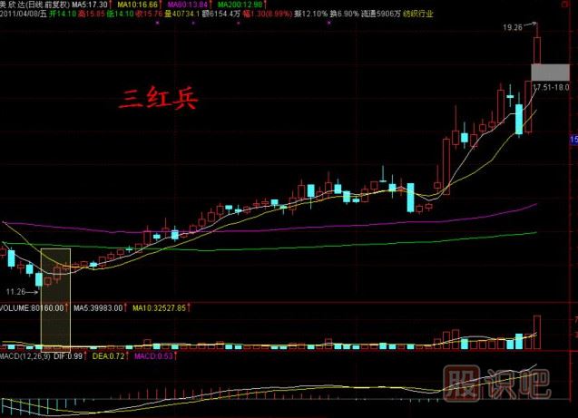 五、三紅兵:在均線附近或者下方連續(xù)出現(xiàn)三根低開高收的小陽線,并且量有逐步放大的趨勢,預(yù)示著有小規(guī)模的資金在逢底吸納,后市將看好。低開高收三小陽。