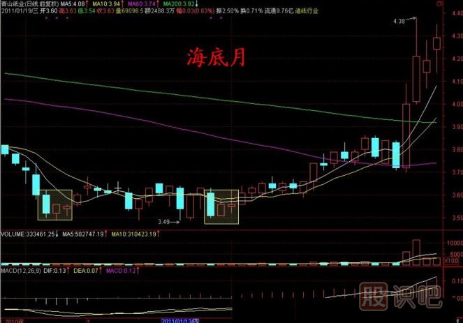 二、海底月:它的具體要求是第一天收中陰線或者大陰線,第二、第三天收上升形態(tài)的小陽或十字星,并且三天中有成交量放大趨勢的跡象。大陰線好比是一只大船沉入海底,但在底部受到強(qiáng)大的支撐,并有超過其下跌的能量維持它的上升,因此假如說均線系統(tǒng)是往上的,中線指標(biāo)看好,沒有理由認(rèn)為該大陰線是行情的中止,應(yīng)該考慮這是主力刻意打壓造成的,因此出現(xiàn)這種情況可以認(rèn)為是新一輪行情的旭日東升。大陰轉(zhuǎn)小連陽。