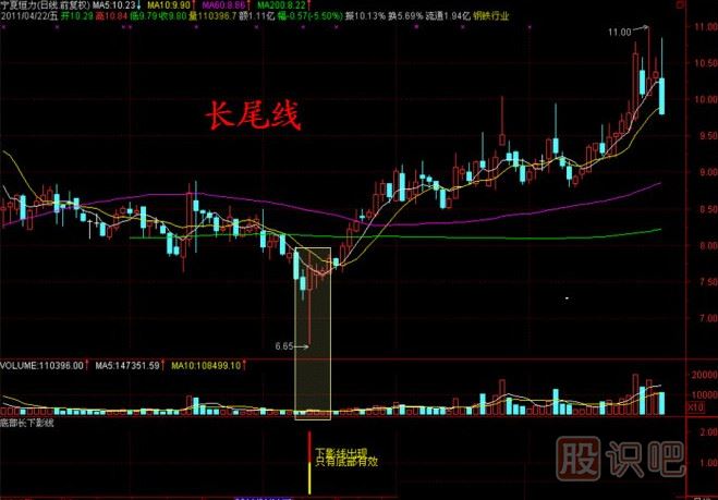 七、長尾線:當(dāng)天開盤之后,股市出現(xiàn)放量下跌,但之后莫名其妙被多頭主力拉升,留下了一個長長的下影線,這是做反彈資金介入的信號,只要第二天重拾上升路,上升空間就很明顯。底部是由形態(tài)構(gòu)造的,但成交量起了一個關(guān)鍵性的作用,無論是縮量也好、放量也好,都必須要有個規(guī)律,比如說逐波縮量、溫和放量這都是一種向好量變過程,但假如說有放量不規(guī)則、或者說上去的時候成交量很大但沒有漲多少,無論任何形態(tài)都有成為下跌換檔的可能。底部長下影線。