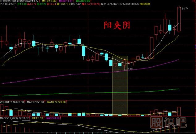 三、陽夾陰:即二根陽線中間夾一根陰線,意思是說第一天股票上揚受到抑制,第二天被迫調(diào)整,但第三天新生力量又重新介入,因此這種上升就比較可靠,后市向好的機(jī)會多。兩陽夾一陰,多方炮。