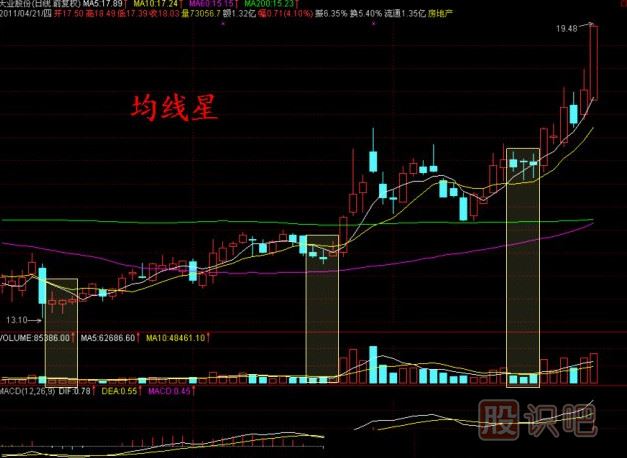 四、均線星:在底部均線系統(tǒng)剛修復(fù)往上的時候,往往會在均線附近收一個陰或者陽十字星,這是多空力量平衡的一種表示,但發(fā)生在底部,第二天極容易出現(xiàn)反彈或者往上突破,這是一種不引人注目的形態(tài)。底部均線十字星。