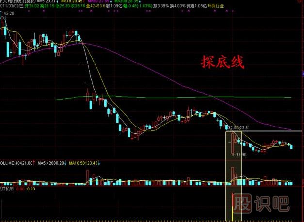 六、探底線:當(dāng)天開盤低開在均線的下方,而收盤在均線的上方,這是主力為了進(jìn)一步做行情而刻意做出來,按照慣性原理后市理應(yīng)看漲。低開大陽。