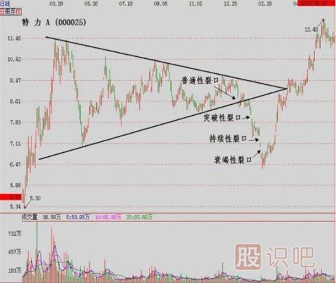 裂口可分為普通性裂口、突破性裂口,持續(xù)性裂口和衰竭性裂口四種。其中,普通性裂口發(fā)生在市場(交易標(biāo)的的價(jià)格)所形成的形態(tài)之內(nèi),一般沒有具體指導(dǎo)交易方向的特別意義,所以也就無須勞心費(fèi)神的去分析研究它了。