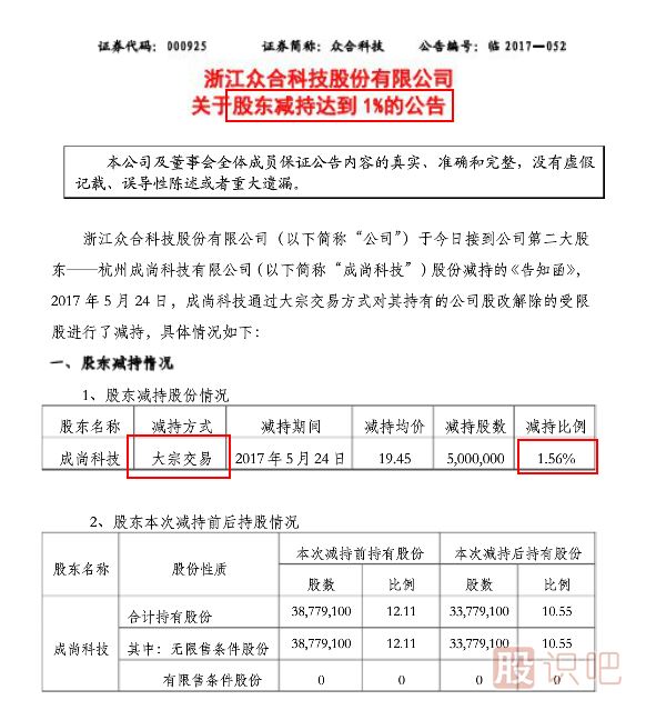 【例2】眾合科技(000925):二股東成尚科技通過大宗交易減持500萬股,減持比例達1.56%