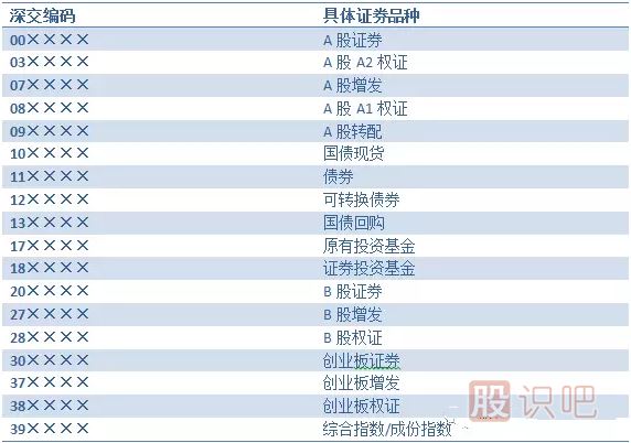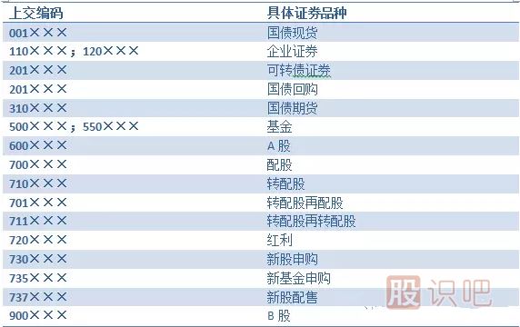 上交編碼:表示在上海證券交易所上市的證券,采用6位數(shù)編制方法,前3位數(shù)為區(qū)別證券品種,具體如下: