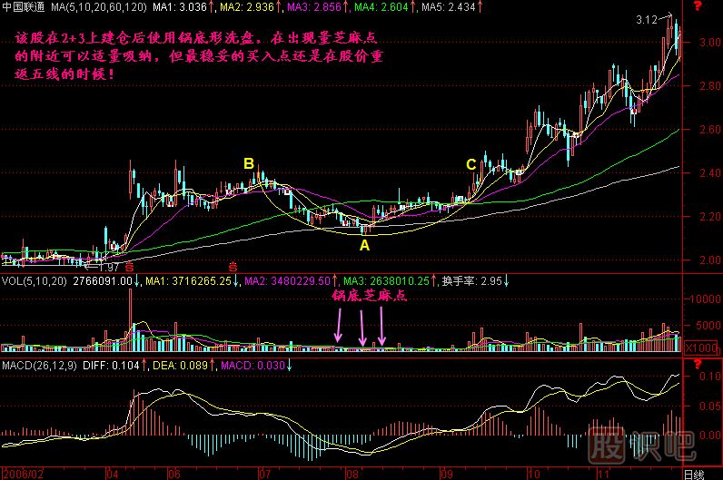 2、A處是股價的最低點,出現(xiàn)鍋底圖形。D、E、L的成交量逐步減小,出現(xiàn)了“芝麻點”,這是明顯的底部信號,這時買入股票,就叫鍋底揀芝麻。