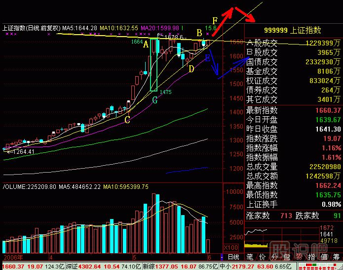 昨天,上證指數(shù)從上午11:00的1667點跌到下午14:40的1628點,一泄39點,令人大跌眼鏡。從昨天的日K線圖上(圖277-1),由A點和B點的收盤價作直線。另外,由C點和D點的開盤價也作直線。這兩條直線構成一個三角形,日k線在這個三角形中已運行到末端。也就是說,日K線最終填滿三角形后,面臨著方向性突破,要么向F點突破,要么向E點突破。