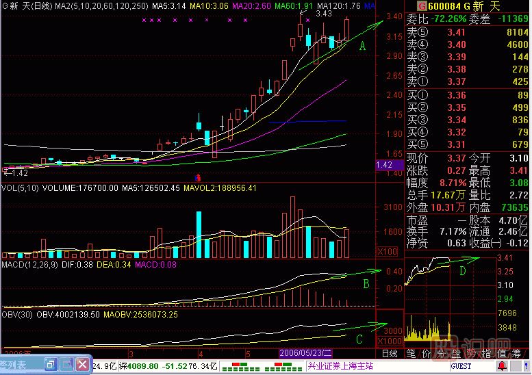 如果有兩個(gè)“空中加油”形態(tài)的股票,一個(gè)油管暢通,另一個(gè)油管閉合,就應(yīng)選擇前者買入。圖中B點(diǎn)是MACD油管暢通,這是強(qiáng)勢(shì)表現(xiàn)。C點(diǎn)是OBV油管暢通,表示做多能量也能暢通。D點(diǎn)是分時(shí)走勢(shì)油管暢通,表示短線走強(qiáng)。這些大大小小的油管都暢通,確保“空中加油”能順利完成,這種形態(tài)是安全的買入信號(hào)。