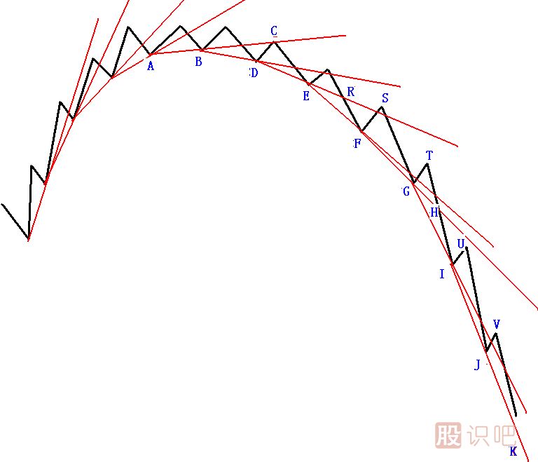 隨著內(nèi)徑線越來越陡峭地下跌,終于內(nèi)徑線變成不可能跌破之線,成為支撐線。如圖中JK線可能更陡峭,股價遇支撐可能反彈,幾次反彈,會形成股價底部或中級底部。