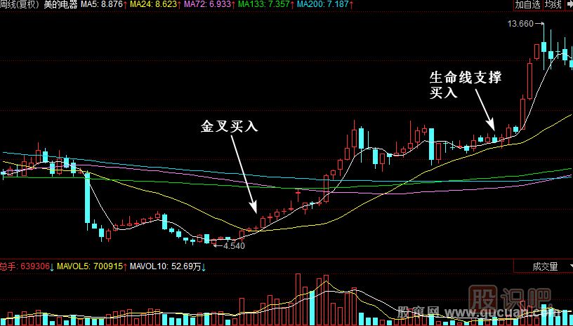 (1)在5日線上穿24日生命線是最好的買入機會。成交量配合就是最佳切入點。