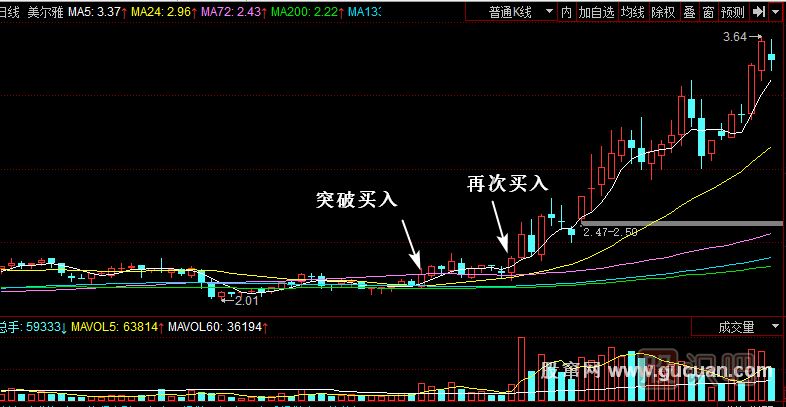 美爾雅(600107)該股是非常典型的均線多頭股。在2元附近構(gòu)筑了一個(gè)平臺(tái),均線在2.20元附近形成了粘合在一起的均線組合。5日線緩慢地突破所有的均線,然后回抽24日生命線受到支持,下影陽(yáng)線突破平臺(tái),進(jìn)入加速狀態(tài)。這時(shí)均線已經(jīng)開(kāi)始形成強(qiáng)勢(shì)的特征。明顯要展開(kāi)一波超級(jí)大行情。一般的人都沒(méi)有立刻采取果斷行動(dòng)買(mǎi)入,只有主力不斷地買(mǎi)進(jìn)。成交量也是從5日上穿60日均線之后再次回抽60日均線受到支持,推動(dòng)股票大幅度上漲的底部巨量終于出現(xiàn)了。