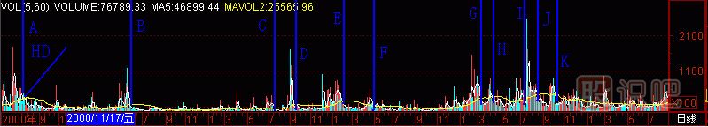第二步實驗,把以上成交量柱體圖上方的相對應的K線圖掛出來,看看“黑洞”拉出來的“天線”指向K線的頭部還是底部?還是其它部位?觀察“黑洞”是否“吞噬”一切靠近它的“能量”?做多力量被“吞噬”后,股價能不能上升了?可怕的股價頭部是不是形成了?每一個“黑洞”是不是對應每一個股價頭部?