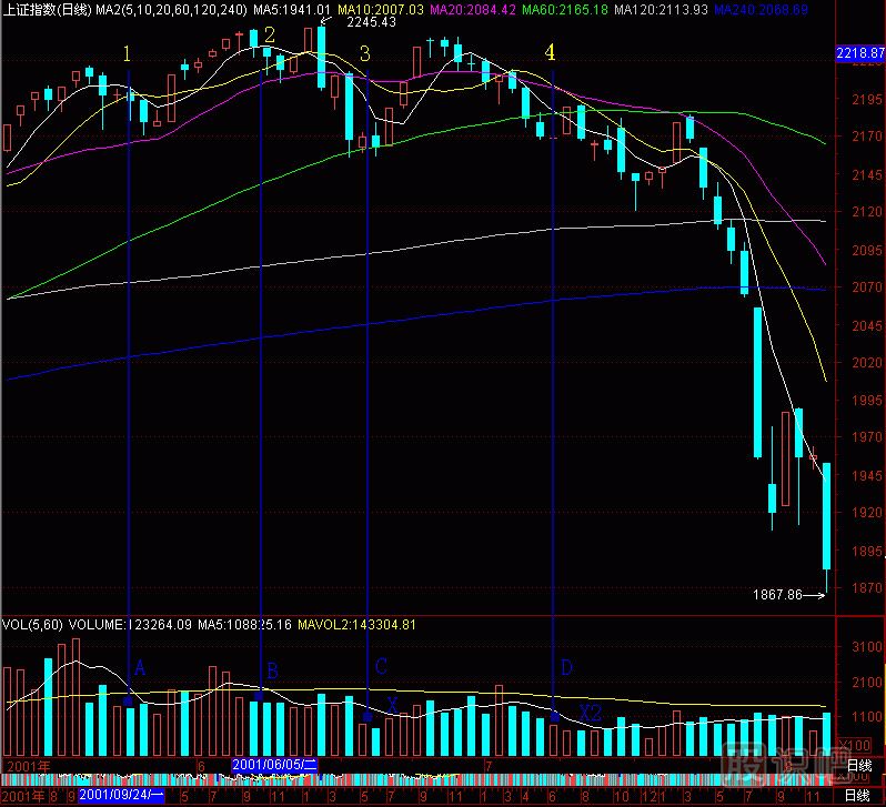 這就是2001年5月22日的2210點到2001年7月10日的2189點的情景。當市場還處于一片看好后市的歡呼聲中時,我們開始清倉撤出股市,并組織旅游隊外出旅游,以防又殺回股市。2001年7月6日晚,我還寫了《滬深兩市已經(jīng)進入空頭市》,引來無數(shù)罵聲。我顧不得挨罵了,要把頭部告訴更多的人,以后每周一篇空頭文章,最終被罵為“黑嘴”。