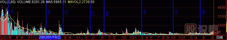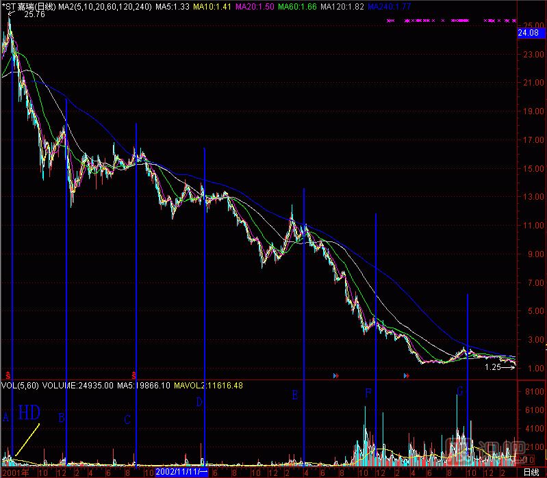 再找個股做試驗,(圖291-18) *ST嘉瑞000156的成交量柱體圖上有A至G共7個黑洞,拉起7根天線,對應了7個頭部。也就是說,在25元處沒逃走的話,以后“黑洞”又給你6次逃跑機會,只要逃,就不會遭受跌到1.25元的悲慘下場。