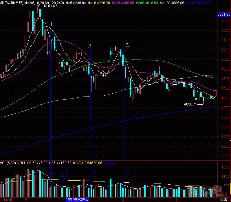 也許會有人問,“黑洞”對深成指頭部預測效果如何?請看,(圖291-13) 對應(圖291-5)深圳成指日K線的全圖。(圖291-13)的成交量柱體圖上有A、B、C三個“黑洞”,那時,我們還不知道這成交量柱體圖是哪個股票的,現(xiàn)在明白了,是深成指的。天線A、B、C對應的日K線圖,是:A天線對應5日、10日價均線死亡交叉1,B天線對應5日、10日價均線死亡交叉2,