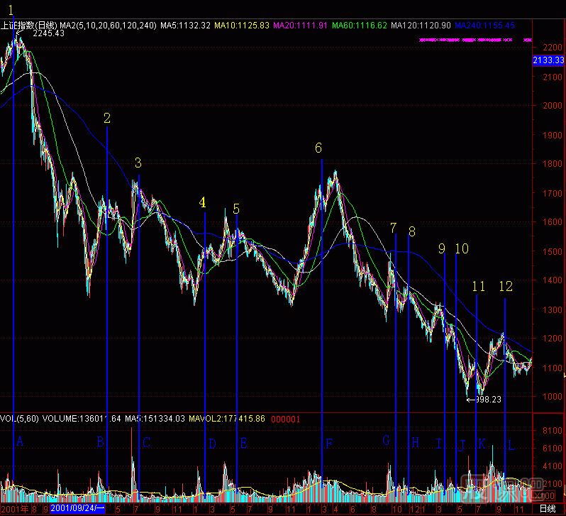 A、B、C、D、E、F、G、H、I、J、K、L。分別指向K線圖上的頭部位置是:1、2、3、4、5、6、7、8、9、10、11、12,每一個“黑洞”對準每一個“頭部”,而每一個“頭部”也對應每一個“黑洞”,一個蘿卜一個坑,不多不少。“黑洞”人人找得到,“頭部”卻很難找。現(xiàn)在發(fā)現(xiàn)它們是伴侶關系,找到“黑洞”,就找到“頭部”了,你見過這么方便而準確的頭部預測嗎?