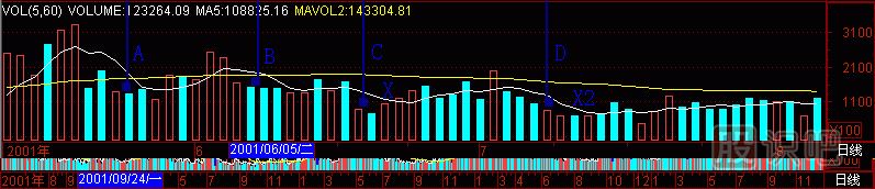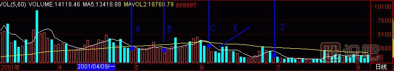 再到上海B股指數(shù)上作試驗,(圖291-15)成交量柱體圖上有A、B、C、D四個“黑洞”,各自拉起一根天線,對應1、2、3、4個K線位置,正好是上海B股指數(shù)日K線的241點頭部區(qū)間,在這里清倉是何等快樂呀!