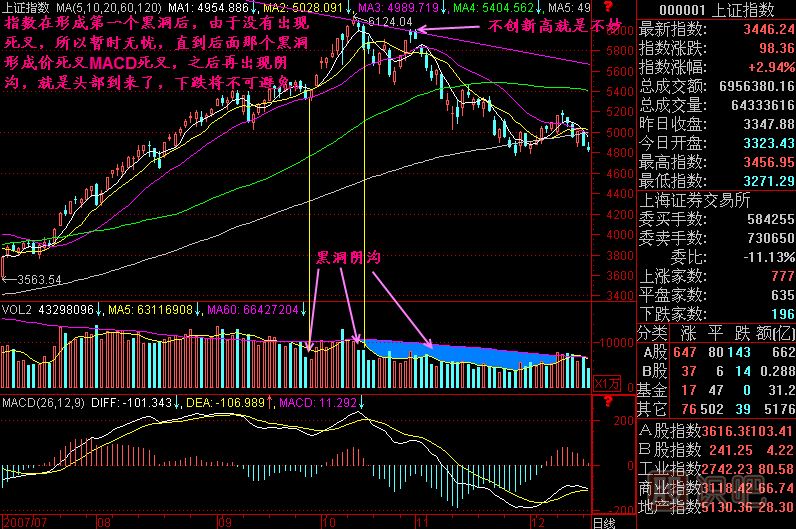 需要強調的是,在成交量形成黑洞之后,如果股價同步形成死叉或者價壓,則頭部下跌已經(jīng)不可避免。