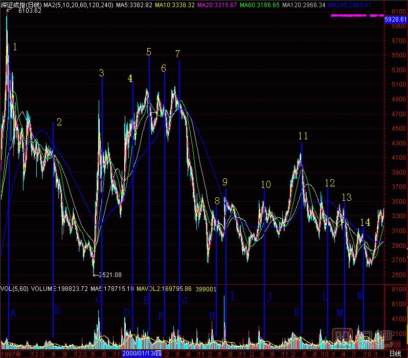 深圳成指從5091點跌到2590點的過程中,“黑洞”預報“頭部”效果如何?請看(圖291-14)深圳成指成交量柱體圖上有A至N共14個“黑洞”,拉出14根天線,對應14個深圳成指的頭部。不多不少,不偏不倚,全部對準。