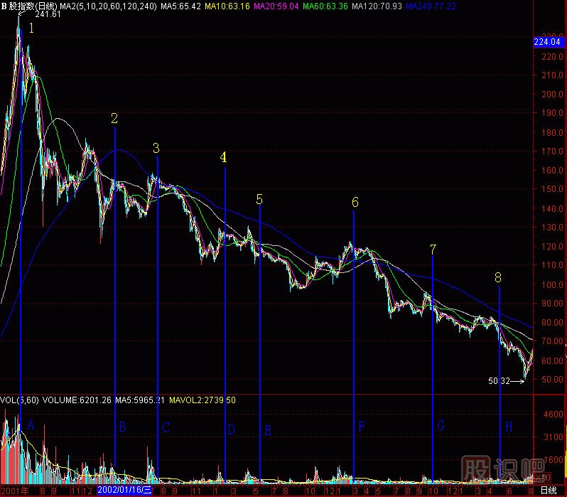 在(圖291-16)中上海B股指數(shù)的成交量柱體圖上有A至H共8個黑洞,拉起8根天線,對應了8個頭部。效果良好。1至2中間好像有個“頭部”沒預報,其實A至B之間還有幾個“黑洞”,只是規(guī)模小一些,不作重點分析了。