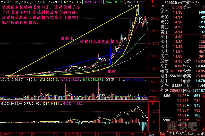 對(duì)于突發(fā)性的利好或者突然爆發(fā)的指數(shù)行情(比如519行情),莊家必須采用緊急拉高建倉的手法,在時(shí)間上已經(jīng)不允許他從容不迫地吸籌了,那么就會(huì)走漲拱的線路。對(duì)于時(shí)間充裕的莊家,則喜歡走的是漲凹的線路,因?yàn)檫@樣可以在低價(jià)區(qū)間延長建倉時(shí)間,從而為吸納足夠多的廉價(jià)籌碼服務(wù)。