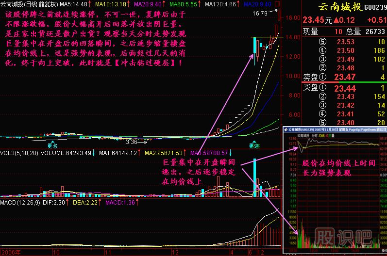 股價(jià)在連續(xù)的暴漲后也會(huì)遇到壓力,這個(gè)時(shí)候往往放出巨量,有時(shí)候還是陰巨量,這就像沖擊鉆遇到硬層一樣,這個(gè)時(shí)候要觀察分時(shí)走勢(shì),如果走勢(shì)基本強(qiáng)勁的,說(shuō)明主力并沒(méi)有出貨,其實(shí)你從側(cè)面想想也知道,突然漲那么高,散戶(hù)看到放出巨量,一定怕得要命,早就在震蕩中出逃了,主力是不可能在當(dāng)日出逃的,沒(méi)人有這個(gè)膽量來(lái)這么高的地方接盤(pán),所以只能是散戶(hù)在出逃,而主力在吸納護(hù)盤(pán),主力要出貨只有華山一條路——漲!而一旦股價(jià)橫盤(pán)完畢向上突破瞬間,就是沖擊鉆過(guò)硬層,股價(jià)還有慣性上升,投資者可抓緊機(jī)會(huì)買(mǎi)入!