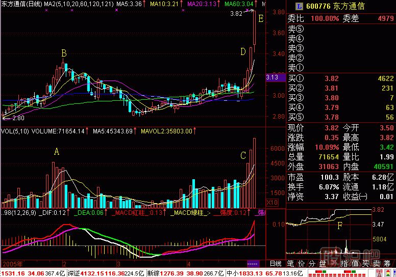在B點(diǎn)和D點(diǎn)之間,是股價(jià)回檔的谷底,與其對(duì)應(yīng)的是成交量柱體圖呈“量芝麻點(diǎn)”狀態(tài),這是洗盤(pán)徹底的特征。C點(diǎn)連續(xù)放巨量,且量大于A點(diǎn)的成交量柱體圖,說(shuō)明莊家更大力度地收集籌碼。F點(diǎn)處,今日分時(shí)走勢(shì)圖上,股價(jià)曲線與均價(jià)曲線保持通氣走勢(shì),這也是典型的收集籌碼走勢(shì)。既然莊家還在收集籌碼,說(shuō)明B、D和E一帶的股價(jià),還是莊家的成本價(jià)。今天買(mǎi)進(jìn)的,包括明天開(kāi)盤(pán)后買(mǎi)進(jìn)的,都與莊家成本價(jià)相仿。