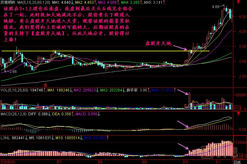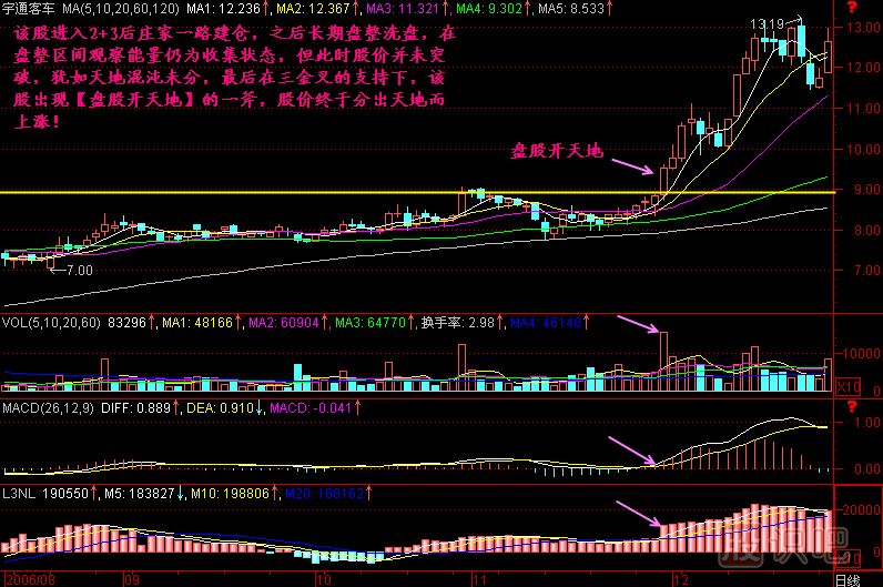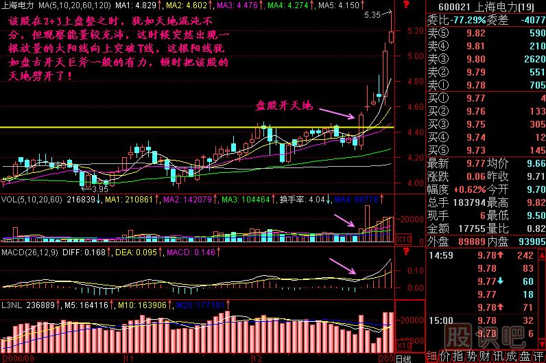 小結(jié):一只股票在莊家建倉后往往沖入2+3區(qū)間,但莊家不想散戶在沒拉升之前跟進,也不想抬高自己的建倉成本,因此莊家要讓股價橫盤,進行沉悶而寂寞的盤整,耐不住盤整寂寞的散戶就會拋出該股而去追漲其它股票,這個時候的盤整方向不明,猶如天地混沌未分一般。一旦莊家洗盤完畢,決定啟動股價了,會推出一根突破前T線的陽線,這根陽線是上漲行情的開端,它使混沌未分的股價頓時方向明朗起來,它就稱為盤股開天地!