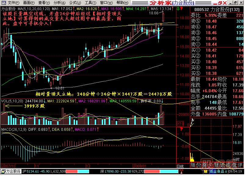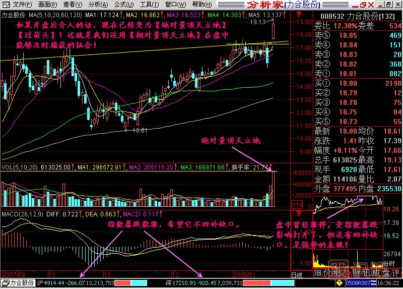 小結:該節(jié)的相對量頂天立地計算公式,非常適合在盤中及時發(fā)現(xiàn)收盤后,成交量可能成為絕對量頂天立地的股票,這樣就為我們盤中及時介入提供了可能。