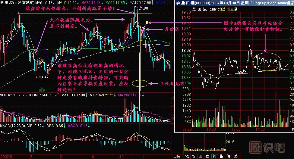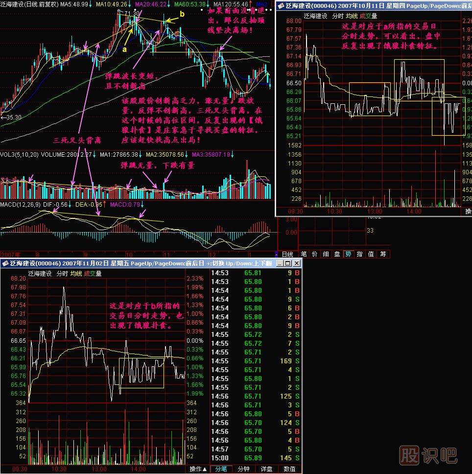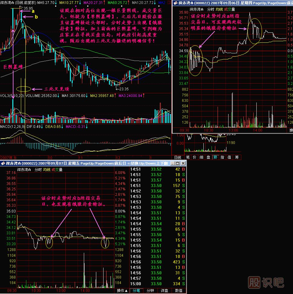 小結(jié):分時(shí)走勢出現(xiàn)餓狼撲食是不好的征兆,特別這個(gè)走勢出現(xiàn)在日K線相對(duì)高位的話,比如三死叉附近或者價(jià)壓附近的話,是莊家正在尋找買盤賣出的特征,遇到這樣的個(gè)股可得倍加小心,最好馬上尋機(jī)退出,否則可能成為莊家出貨的犧牲品!