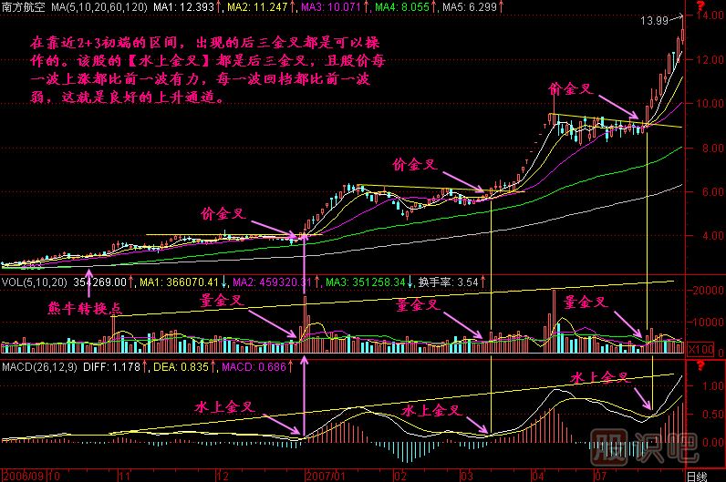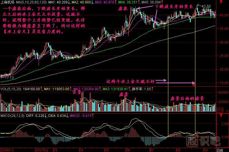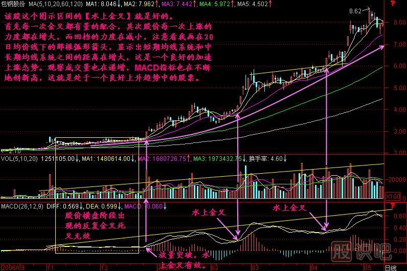 一只股票要維持良好的上升通道,應(yīng)該是一波比一波漲勢有力,一波回檔比一波回檔淺,直到最后沒有回檔的飆升出現(xiàn),那就接近頭部了。而一波比一波漲幅沒力,回檔卻開始變深的時候,就要小心了。在這之后出現(xiàn)的所謂水上金叉已經(jīng)沒有爆發(fā)力了,所以這樣的金叉不是我們能操作的金叉了。