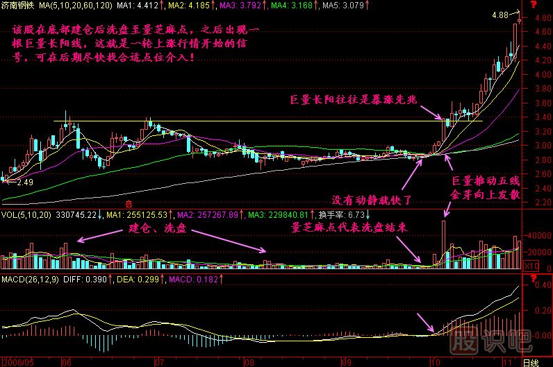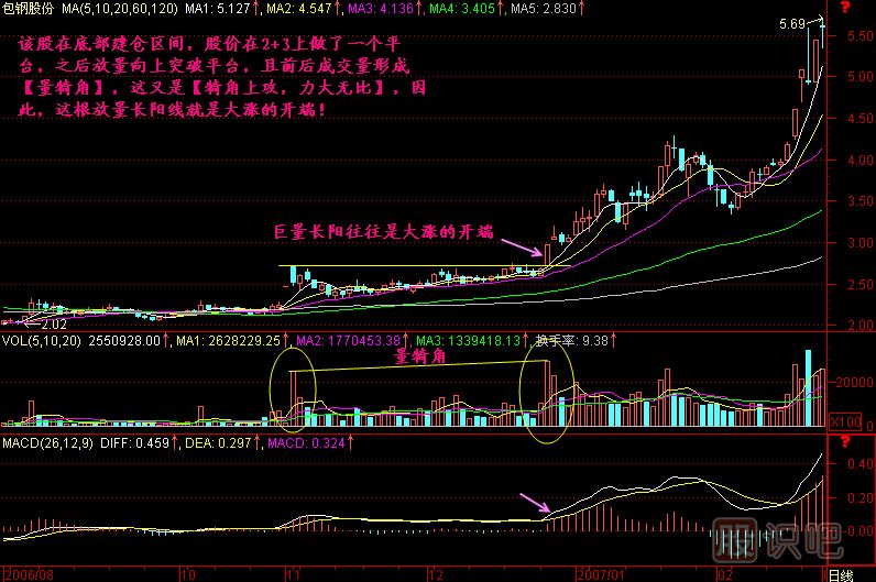 小結(jié):當一只股票暴露出莊家建倉的痕跡后,一旦放巨量向上突破平臺,則是大漲的開端,起碼要走一段路,否則莊家沒法出貨,這就叫巨量長陽往往是大漲的開端。