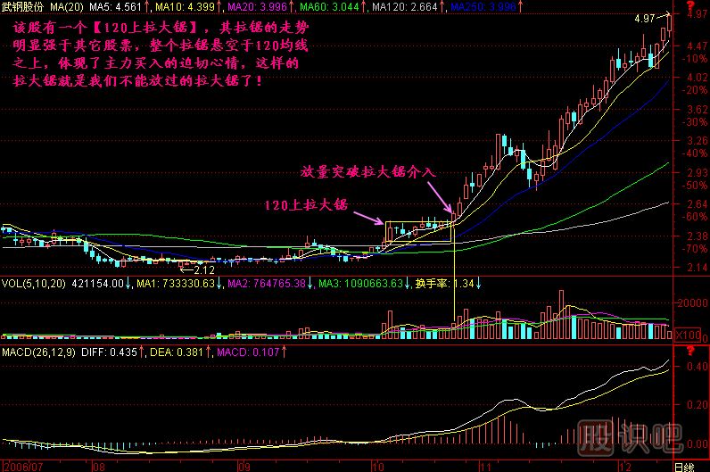 從強(qiáng)弱度來(lái)說(shuō),我們最看好的是120上拉大鋸,因?yàn)樗砹酥髁I(mǎi)入的迫切心情,這樣的拉鋸之后一般漲幅都大些,而對(duì)于120線拉大鋸,則體現(xiàn)了主力的買(mǎi)入興趣沒(méi)有前者強(qiáng),所以如果有兩個(gè)股票,一個(gè)是120上拉大據(jù),另一個(gè)是120線拉大鋸的話,我們一般挑選120上拉大鋸的股票。