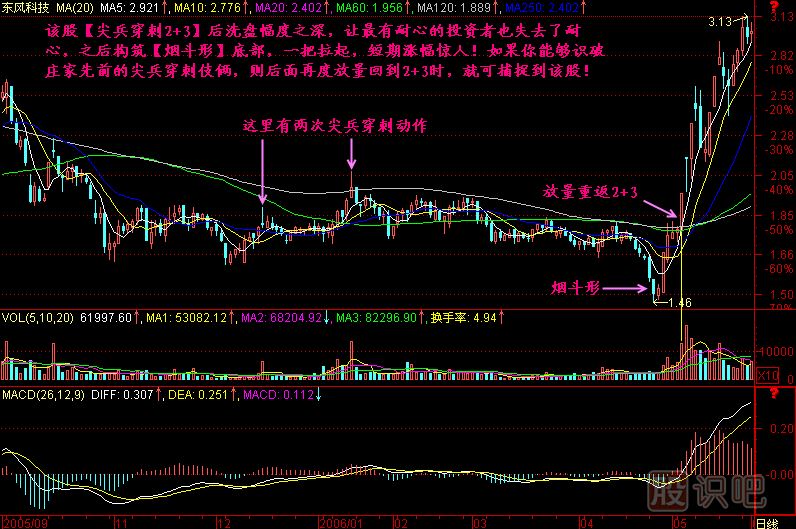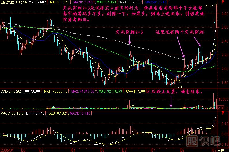 這就是尖兵穿刺2+3的市場行為,這個(gè)動作往往發(fā)生在莊家底部打樁區(qū)間,當(dāng)然也可以發(fā)生在2+3之上的某個(gè)相對低位的高點(diǎn)上,在那里的話也可以叫仙人指路。