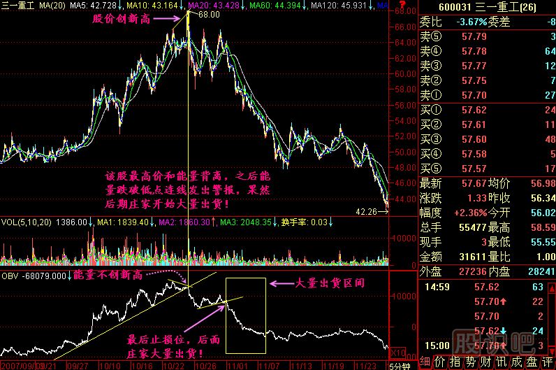所以對于一個正在上漲的個股,我們如何防止被套牢在頭部呢?就是在結合其它頭部技術研判的同時,要使用5分鐘OBV能量潮分析一下,就可以做到莊家出貨看得清清楚楚了。