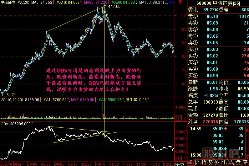 晚上剛剛收到一個Email,我們在全國的學員很多,對一些有典型意義的問題我們現(xiàn)在做一個統(tǒng)一回答。他問中信證券是不是在出貨?有這個感覺當然很好。為了回答這個問題,我們把中信證券5分鐘K線調出來,然后分析下邊的OBV指標,見(圖204-1)所示。