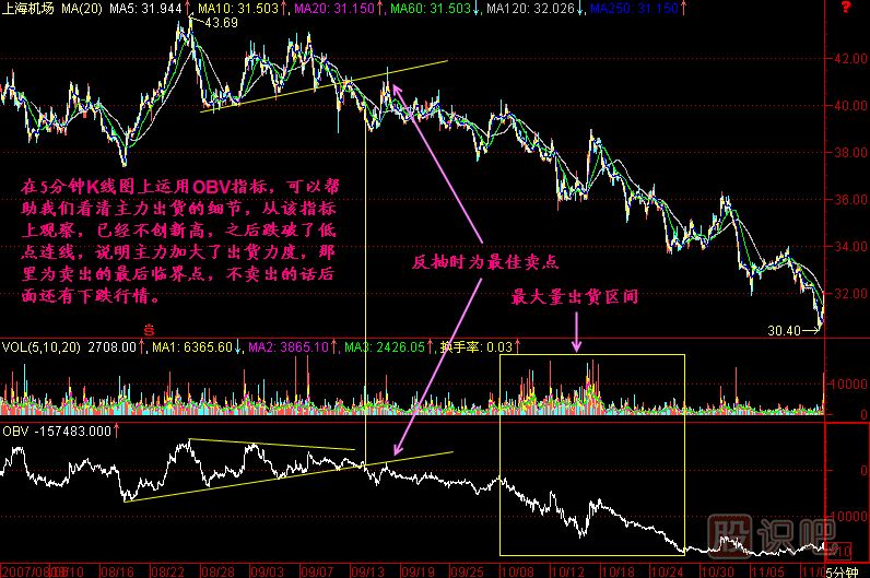 在緩慢派發(fā)時,表面上看,股價可能是創(chuàng)新高乏力,但如果查看5分鐘OBV能量潮,會發(fā)現(xiàn)能量潮已經不能創(chuàng)新高了,而股價還在創(chuàng)新高。而當能量潮跌破低點連線時,就是莊家從維護股價出貨的階段,轉變到全力出貨的階段那個臨界點,那里就是我們必須撤退的位置,如果你不撤退,小則要吃一個回檔,損失其它黑馬機會,大的話可能就是整個股價的頭部,很可能因此就套牢了。