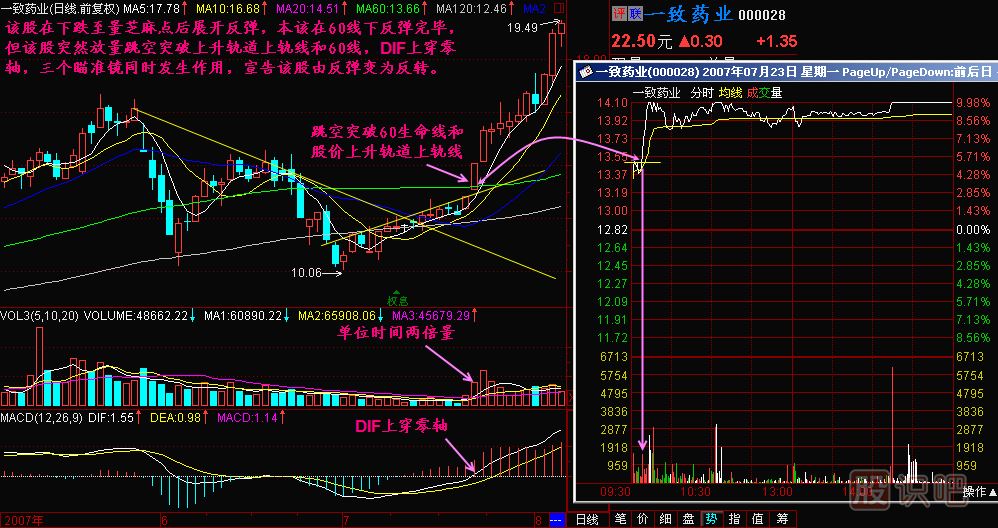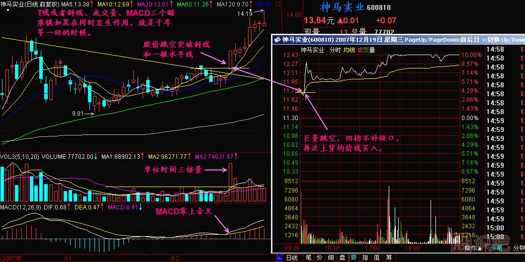 我們從股價的回檔開始一直跟蹤分析到現(xiàn)在,說什么呢?說這個金三角一定能沖過去,現(xiàn)在股價正在上沖金三角,為什么不追呀!所以基本功學好了,追漲就有信心,就在股價上沖金三角的時候千軍萬馬沖了過去,怎么沖的?我們要掌握好幾點:第一個,圖中我們畫了三個瞄準鏡,第一個瞄準鏡瞄在什么地方呀?就是2.87元這個地方,也就是說只要股價能通過2.87元,我就打!千年追一回呀!這么明確的事情,此時不追更待何時!在分時走勢圖上我們就瞄在2.87元這個位置上,所有的火力都集中在這個地方,怪不得這個地方的成交量那么大,是不是我們的同學們都在這個地方使勁,千軍萬馬殺了進去,股價就一路上揚。第二個瞄準鏡瞄在什么地方呢?就是當成交量沖過前面這個5日平均量的最高點的一瞬間,就開始動手。第三個瞄準鏡是瞄準MACD的后金叉,就在DIF上穿0.00的一瞬間,千萬發(fā)子彈就出去了。在我們廣通技術里邊這三個瞄準鏡被稱做什么呢?第一個是T線瞄準鏡、第二個是成交量過前頭瞄準鏡、第三個是DIF零位瞄準鏡。這三個瞄準鏡如果同時發(fā)生作用的話,此時此刻就是開火的時候,也是我們千年追一回的千載難逢的機會。