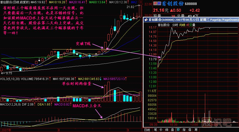 小結:千年等一回是指我們平時關注的股票,在同一天或者前后一天同時出現(xiàn)股價放量突破T線或者高點連線、成交量放大(標準就是單位時間兩倍量)、MACD中DIF上穿零軸或者水上金叉,這三個信號就是我們的三個瞄準鏡。當以上信號同時出現(xiàn)時,這是信號的共振,三個不同的信號在同時給出,就是我們敢于追漲的時候。