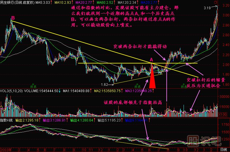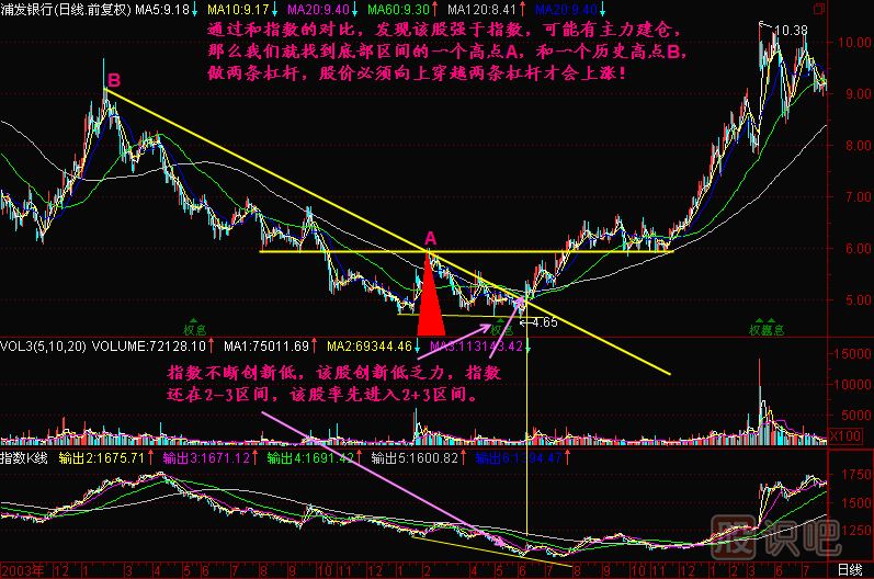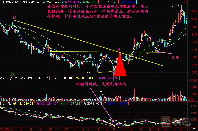 小結(jié):在指數(shù)長(zhǎng)期下跌后,我們可以通過尋找那些領(lǐng)先于指數(shù)底部抬高的個(gè)股,這些個(gè)股往往是主力資金提前布局的股票,找到這樣的股票以后,我們就找到它底部打樁區(qū)間的一個(gè)高點(diǎn)做為原點(diǎn),通過這個(gè)原點(diǎn)與一個(gè)近期的歷史高點(diǎn)做線,得到一根杠桿,另外一根杠桿就是這個(gè)原點(diǎn)底部區(qū)間的高點(diǎn)連線或者就是通過它做的水平線。