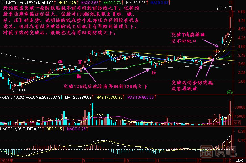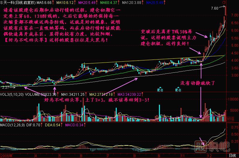 而對于能夠在大盤見底開始上漲之后做到好馬不吃回頭草的股票,說明主力決心堅(jiān)決,且資金實(shí)力較強(qiáng)!他比較看好該股的后市,也許基本面有什么不為人知的利好,而該利好只有主力知道。這樣的股票往往在突破一條防線之后就不會(huì)再回到該防線之下,且股價(jià)走勢比較有陽剛之氣!突破T線后往往能夠快速拉離成本區(qū)一段路,這樣的股票除了主力自身較自信外,還表現(xiàn)一個(gè)實(shí)質(zhì),主力不肯給散戶過多逢低吸納的機(jī)會(huì),這樣的股票后期漲幅往往較大!