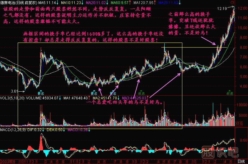 小結(jié):一只好的股票,在大盤開始上漲之后,它應(yīng)該表現(xiàn)為好馬不吃回頭草,只有這樣的股票才說明莊家建倉積極,每突破一條防線之后,莊家就舍不得再讓股價(jià)回到該防線之下了,如果能夠回下來,就意味著莊家愿意讓散戶來逢低吸納,這就從一個(gè)側(cè)面說明幾個(gè)問題,起碼說明莊家決心不夠強(qiáng),或者說明莊家的資金實(shí)力有限,還可能是該股基本面有某種不確定性,使得莊家比較猶豫,還可能是多個(gè)主力在對弈,這樣的股票就不可能是好股票!