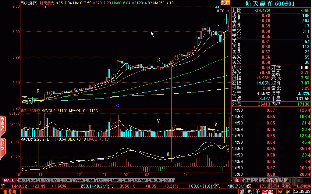 二次零上紅金叉圖260-1(圖260-1)C點(diǎn)處,出現(xiàn)MACD金叉,但是零軸線之下的金叉。按照廣通技術(shù)講,零下金叉都是弱市中的反彈買(mǎi)進(jìn)點(diǎn),買(mǎi)入后能漲多少就...