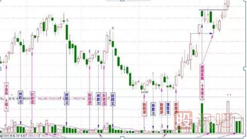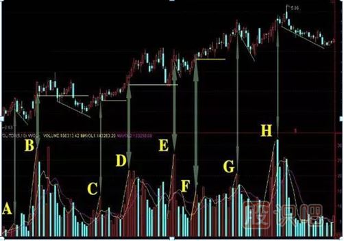圖中ABEGHA之后的股價每況愈下,而CDF卻蒸蒸日上。這兩種走勢給我們啟示是價升量漲順邊走勢時高點逢陰即出,而倍離走勢即量縮價升時持股待漲。