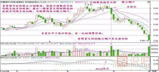 圖形特征:當股價在高位盤整后漸漸下滑,此時5日、10日和20日均線形成的均線系統(tǒng)呈現(xiàn)收斂狀態(tài)。此時如出現(xiàn)一根陰線跌破三條均線形成一陰斷三線的“斷頭鍘刀”,則應警惕有一輪跌勢。特別是帶有較大成交量的陰線,則更有下跌的可能。