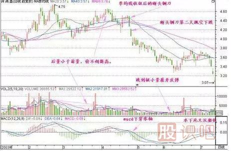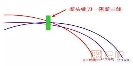 當5日、10日和20日內(nèi)買進股票的平均成本越來越接近時,人們發(fā)現(xiàn)早買或遲買股票一樣都無可盈利,購買股票的迫切性降低。而市場另一方面賣出方已明顯感到購買力降低,愿意用更低的價格出售股票。于是有一天賣出方突然用低于三條均線的價格大量賣出,當日收盤價跌破三條均線,形成“斷頭鍘刀”。5日、10日和20日內(nèi)買進股票的人突然發(fā)現(xiàn)已被套牢,先知先覺者在第二天行情中愿意用比“斷頭鍘刀”這根陰線收盤價更低的價格沽出,于是發(fā)生空殺空行情。此時股票供應量急驟增加,而股票需求量急驟減少,終于誘發(fā)一輪跌勢。
